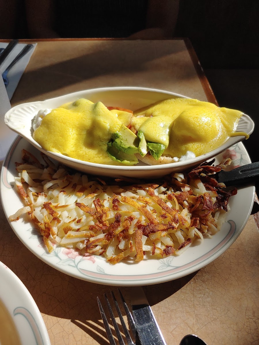 Friendly service and nice atmosphere but the food was hit or miss. My mom’s corned beef dish was really nice and my dad’s combo was good too, however my eggs Benedict were inedible. They were caked in sauce, even after I removed a bunch it was too much and the English muffins were soggy from all the sauce they absorbed. However my parents ate the hashbrowns and the eggs so it didn’t feel right to send it back so I can’t dock them for that as they didn’t get a chance to fix it. My dad’s French toast had a hair in it and the pancakes weren’t great in our opinion they tasted like they came from a box mix
