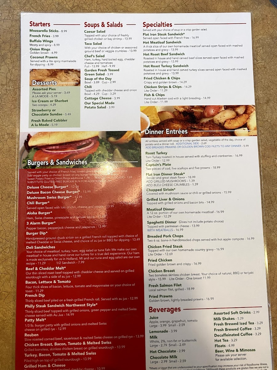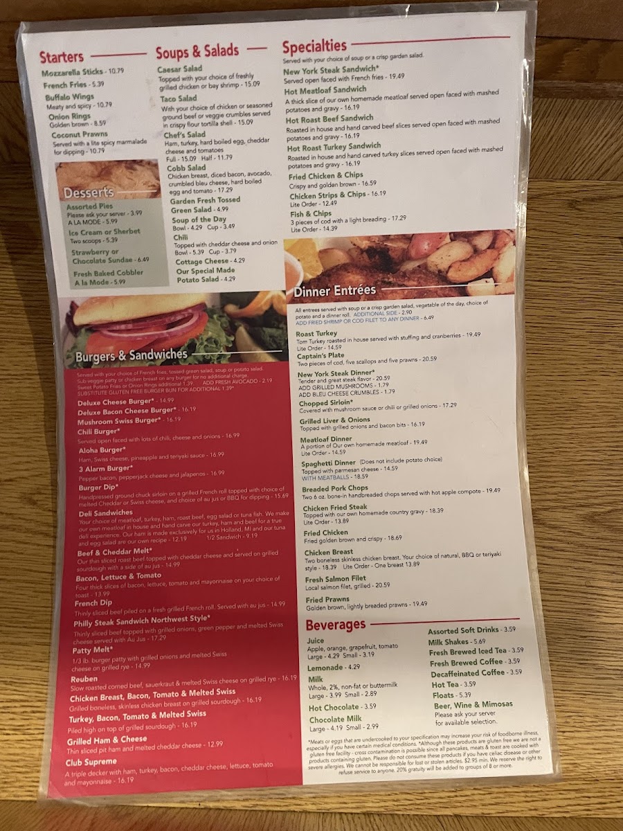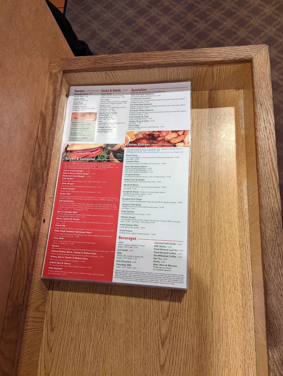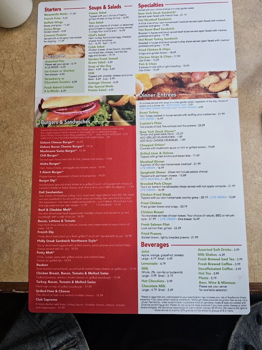 Breakfast staples like the Swedish Pancake Combo, Farmer's Special Omelet, and Potato Pancakes create a cozy and inviting start to the day. The waffles range from the classic golden buttermilk to savory options like the Classic Bacon Waffle, perfect for those who enjoy a blend of sweet and savory flavors. For a midday or lighter option, salads like the Cobb Salad and hearty entrées such as Fried Chicken & Chips provide satisfying comfort without feeling rushed.